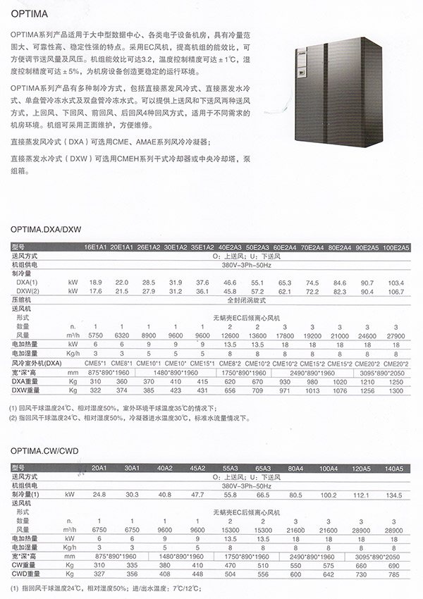 OPTIMA家族機(jī)房專用空調(diào)機(jī)組為機(jī)房提供精密的溫度和濕度控制,具有極高的可靠性、穩(wěn)定性以及節(jié)能性,滿足24×7全天候連續(xù)運(yùn)行要求,是綠色數(shù)據(jù)中心與各類電子設(shè)備機(jī)房的理想選擇。OPTIMA家族機(jī)房專用空調(diào)機(jī)組有多種制冷方式,包括直接蒸發(fā)風(fēng)冷式、直接蒸發(fā)水冷式、單盤管冷凍水式及雙盤管冷凍水式。容量為17.6kW~134.5kW。