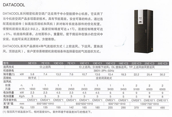 該產(chǎn)品適用于通訊機(jī)房、計(jì)算機(jī)房、數(shù)據(jù)中心機(jī)房、醫(yī)療設(shè)備機(jī)房、科研試驗(yàn)室、精密零部件生產(chǎn)制造設(shè)備車間等需要恒定溫度和濕度設(shè)備工作場(chǎng)所,為這些場(chǎng)合提供24×365全天候的環(huán)境控制。該產(chǎn)品通用性高,性價(jià)比好,節(jié)能性好,運(yùn)行費(fèi)用低,是中小型機(jī)房的良好選擇。容量為5.8kW-30.2kW。